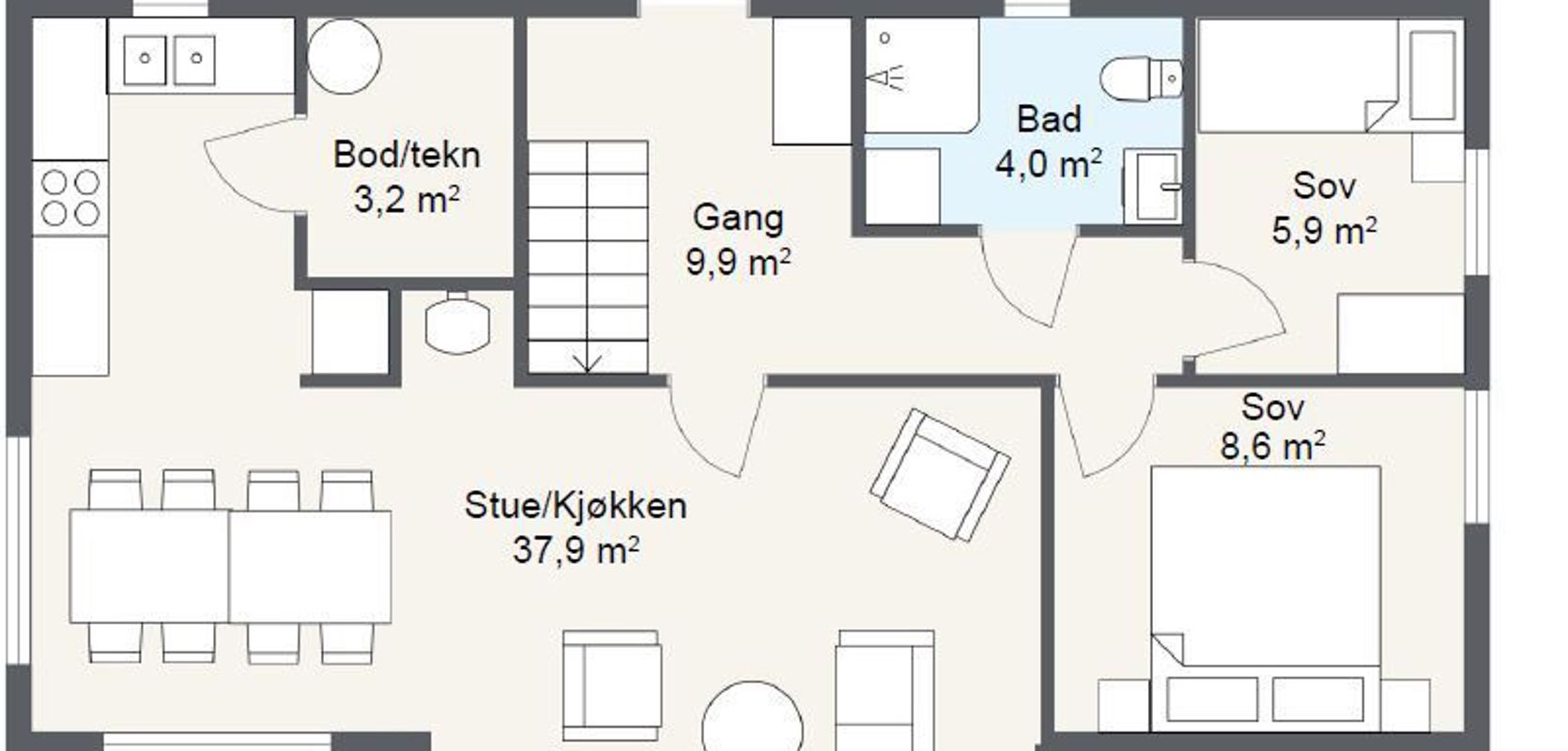 En trapp fra inngangspartiet fører opp til en romslig hems. Med riktig innredning i andre etasje kan du sikre at det er god plass til overnatting ved behov. Du kan for eksempel dele hemsområdet inn i to separate sovealkover og et ekstra oppholdsrom. Dette gir en flott løsning for gjester eller en privat sone for de som ønsker å trekke seg tilbake og ha litt egentid.