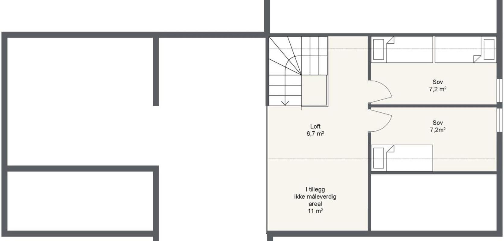 Hytta har en ideell planløsning som møter behovene til en familie. Den byr på tre soverom i første etasje, i tillegg til ekstra soveplasser på hemsen. Det er to bad og en romslig åpen stue- og kjøkkenløsning. Her kan du ha et stort spisebord med direkte tilgang til den romslige terrassen i sørvest. En dobbel balkongdør fører ut til terrassen og er beskyttet av et takoverbygg. Ved siden av inngangspartiet har du en egen inngang til en romslig utebod. Hytta har også et eget teknisk rom like innenfor inngangspartiet. Badet er utstyrt med en vask integrert i en benkeplate og har plass til en vaskemaskin. Dusjområdet og toalettet kan skjermes med frostet glass.